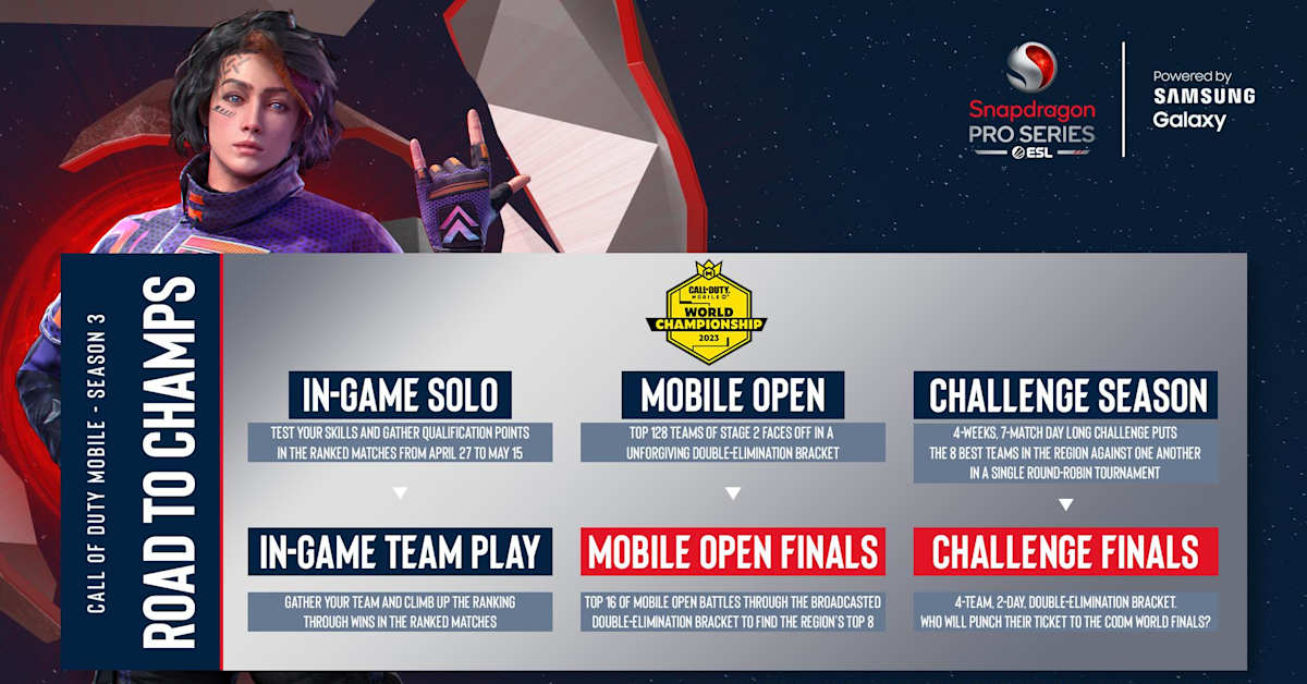 Season 3 of the Snapdragon Pro Series begins with in-game solo play and team play qualifiers. Competitors will test their skills against other Call of Duty: Mobile players in their region. Top-seeded competitors will then battle through Mobile Open and Mobile Challenge ranks (previously known as Stages 3 and 4 of the Call of Duty: Mobile season) with regional prize pools totaling $300,000. World Champs culminates in an epic in-person final where top teams worldwide compete for the $1 million grand prize in December 2023. Call of Duty: Mobile will return for Season 4 of the Snapdragon Pro Series in Fall 2023 and offer teams a chance to claim a seat at the $200,000 Mobile Masters event in early 2024.